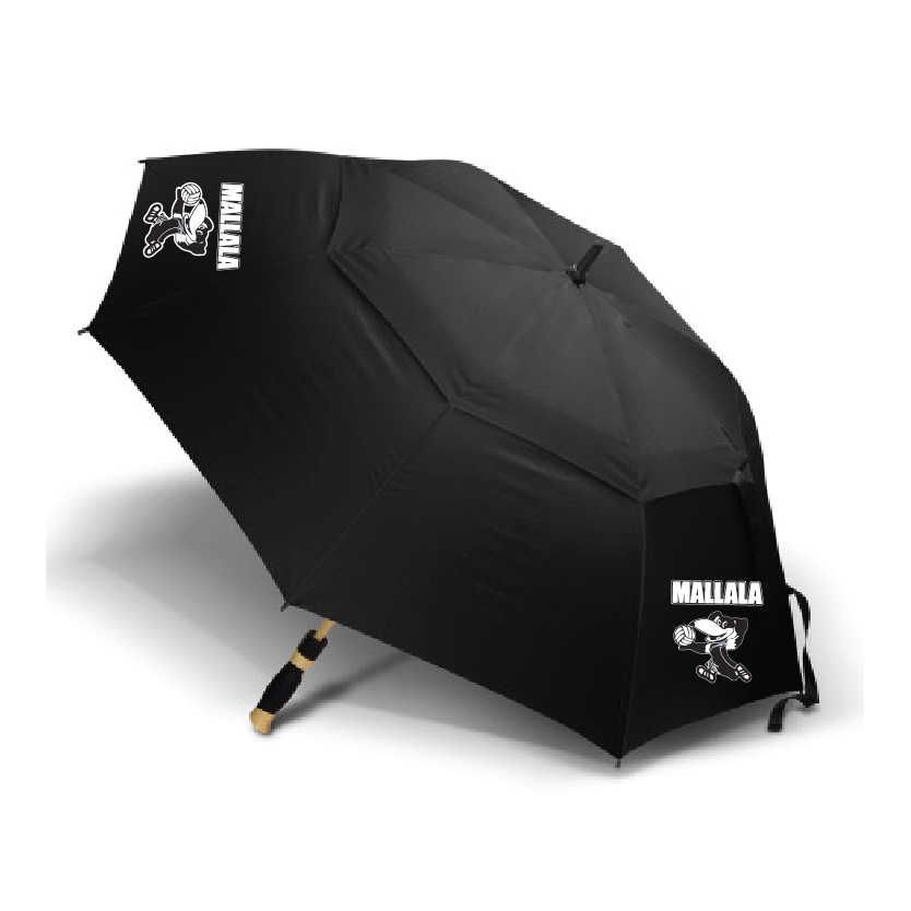 Premium eight-panel sports umbrella with automatic opening. The extra-large vented canopy is made from strong 190T pongee and has 76cm ribs. It has a windproof, wooden-look fibreglass frame and shaft with a wooden-look handle that has a plastic grip.